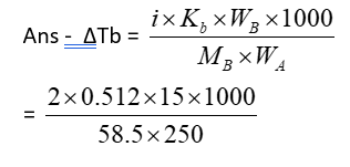Calculate the boiling point of a solution prepared by adding 15 g of NaCl to 250 g of water. (Kb for water = 0.512 K Kg mol-1 and molar mass of NaCl = 58.5 g/mol). Assuming that NaCl is 100% ionized in water.