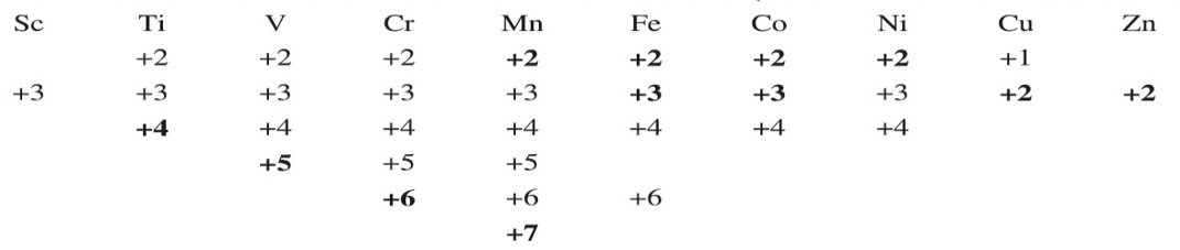 As there is very little energy difference between 4s and 3d orbitals, electrons from both energy levels can be used for chemical bond formation. Therefore all elements except sc and Zn, of the first transition series show a number of oxidation states as shown in table.