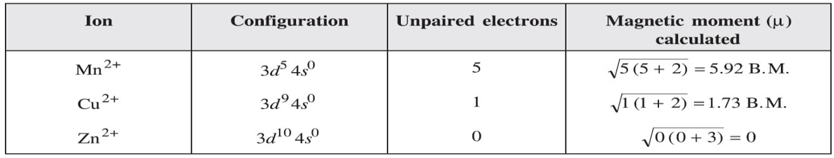 The magnetic moment (μ) of the elements of the first transition series can be calculated with the unpaired (n) by the spin-only formula