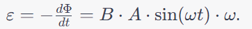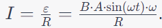 the induced emf is given by ε = B . A . sin(ωt) . ω, and the induced current is given by , where B is the magnetic field strength, A is the coil’s area, ω is the angular velocity, t is time, and R is the resistance of the coil.